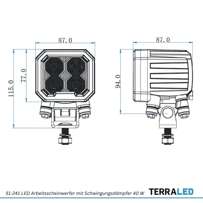 LED Arbeitsscheinwerfer 40 Watt in Heavy Duty Ausführung mit Schwingungsdämpfer - Serie HD91 - für Bagger, Radlader, Steinbrecher und andere Baumaschinen - hohe Vibrationsbeständigkeit