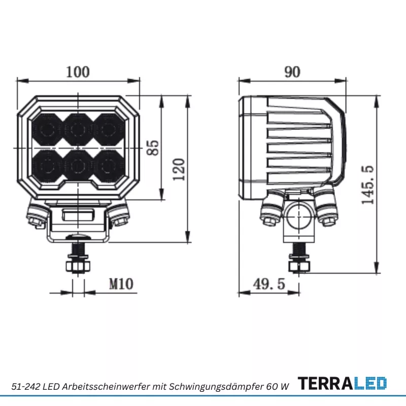 LED Arbeitsscheinwerfer 60 Watt in Heavy Duty Ausführung mit Schwingungsdämpfer - Serie HD91 - für Bagger, Radlader, Steinbrecher und andere Baumaschinen - hohe Vibrationsbeständigkeit